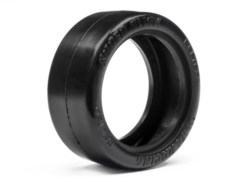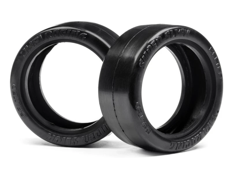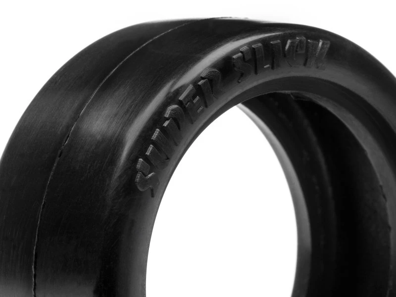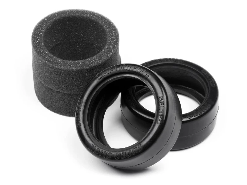 A belted slick rubber tyre for increased durability and grip in dry conditions.