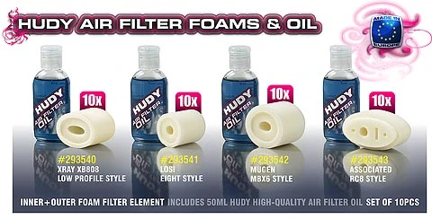 Inner + outer low-profile foam filter element for air filter. Set of 10pcs including 50ml specially-developed #106240 HUDY high-quality air filter oil.
