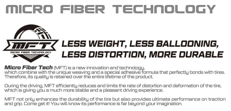 MFT stands for Micro Fiber Technology. This technology indicates the presence of a textile belt in the rubber tread of the tire to prevent the tire from deforming and ballooning during high speed operations.