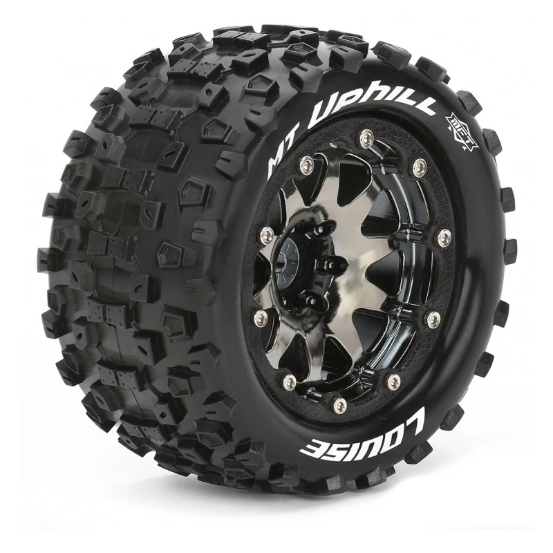 Louise MT-UPHILL Monster Truck MFT Tires on Black-Chrome 1/2″ Offset Bead-Lock Wheels