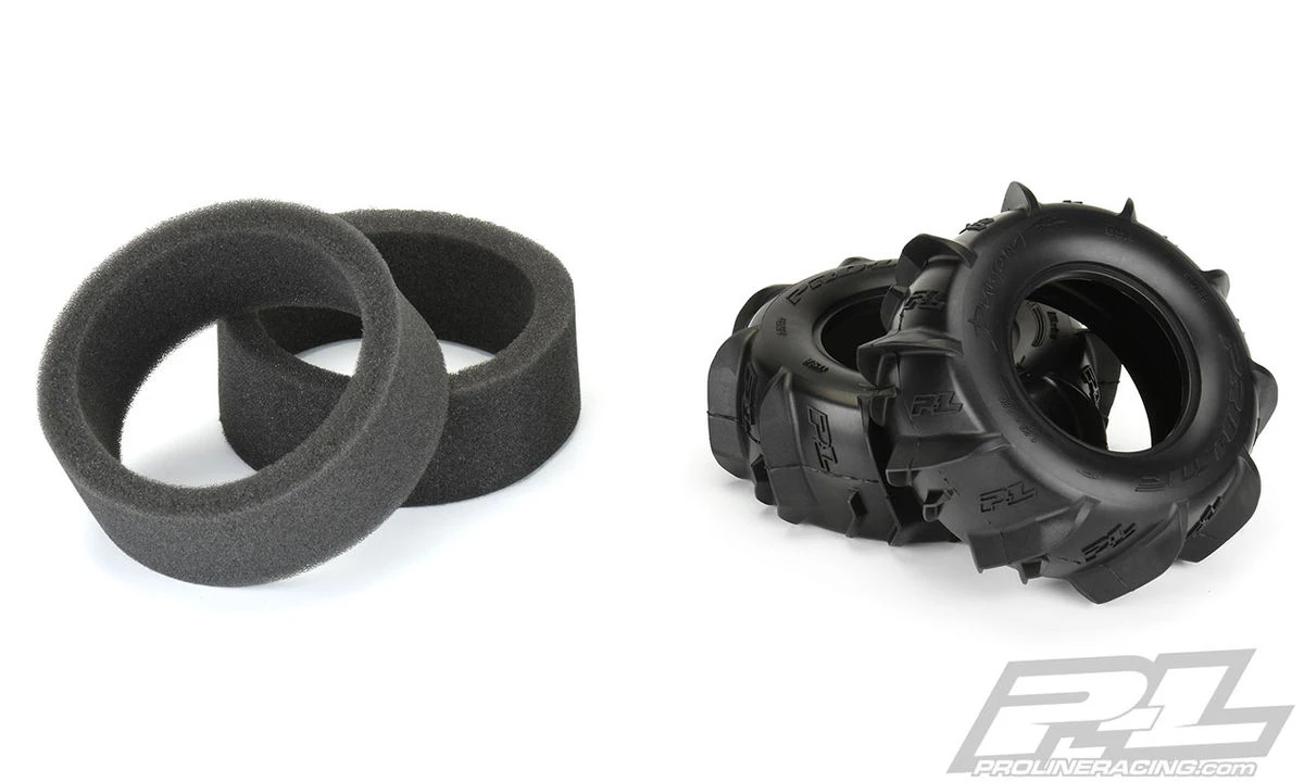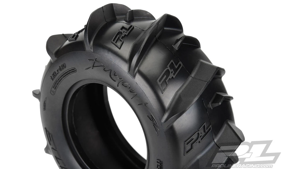 The Dumont SC tire uses the latest in paddle tread technology with large offset V-shaped paddles for maximum roosting power. Pro-Line P-L logos have been embedded into the tire carcass giving it the style that you have come to expect from Pro-Line. The Dumont SC Paddles tire gets its name from the incredible Dumont Sand Dunes in California but these paddle tires are equally at home shredding your local snowfield in the winter. Don’t get stuck spinning your tires in the sand or snow. Get a set of Dumont Paddle tires for your Short Course truck today!