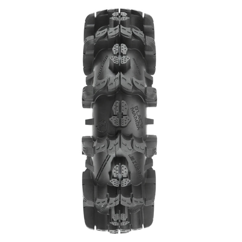 Pro-Line’s officially licensed Interco Black Mamba tires feature a directional tread pattern just like the full-size tires and are just as tough and aggressive as the real thing. Every detail is captured including the lettering on the tire carcass and the multi-stepped tread. Made from Pro-Line’s legendary M2 compound for maximum mud flinging traction from the start. Don’t get stuck in the mud with the wrong tires. Get your own set of fully licensed Interco Black Mamba tires from Pro-Line today!