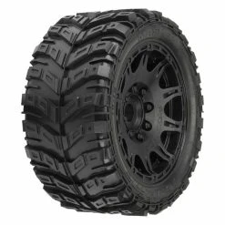 The Raid 5.7″ Black Wheel features a 24mm hex with the standard 1/5 scale through-hole to fit most 1/5 scale vehicles and includes machined aluminum wheel washers to fit onto the popular X-MAXX® platform. Inspired by popular full-size off-road wheels, the Raid 5.7″ wheel is extremely tough and has the bold style to match. The low-profile Masher X HP tires are glued to the big diameter Raid wheel for the ultimate in lightweight, all-terrain performance. The Masher X HP tires are made from Pro-Line’s legendary M2 compound for unmatched grip on the dirt, street, grass, and gravel. This tire and wheel package is proudly manufactured at Pro-Line Headquarters in the USA! If you are ready to take your X-MAXX® and KRATONâ„¢ 8S to the next level of Performance and Durability, then you need Pro-Line’s new Masher X HP BELTED Tires mounted to Raid 5.7″ Wheels!