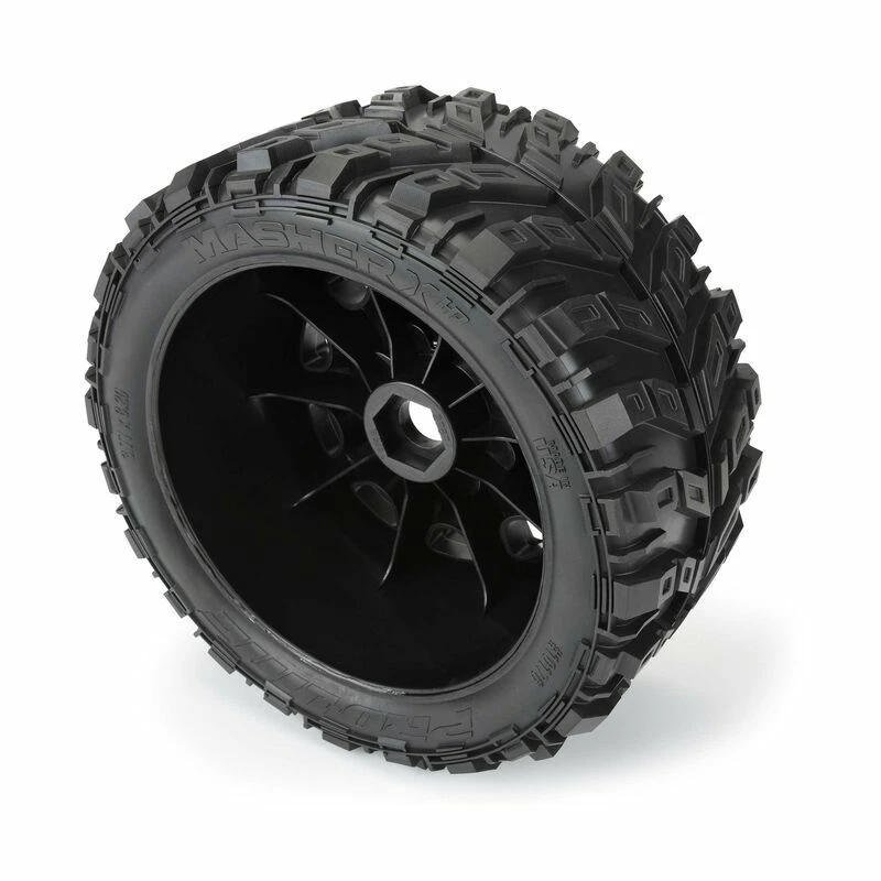 This is a pair of pre-mounted Masher X HP tires for X-MAXX® and KRATONâ„¢ 8S. Pro-Line is ready to unleash the long-awaited lightweight, belted tire solution for X-MAXX® and KRATONâ„¢ 8S owners with the highest performance tire and wheel combo ever conceived: The Masher X HP tires mounted on Raid 5.7″ Wheels! Pro-Line Masher tires are known for being the standard when it comes to chevron Monster Truck style tread and Pro-Line took it to the eXtreme on the Masher X by adding futuristic tread and sidewall detail that will make your truck look incredible and perform amazingly everywhere you go. The all-new Masher X HP tires go one step further by being BELTED to handle extreme power and high speeds with ease. No tire ballooning here! These tires and Raid 5.7″ wheels have been developed from the ground up to be lightweight and durable enough to handle extreme X-MAXX® and KRATONâ„¢ 8S punishment to give you the best all-around bashing experience possible.