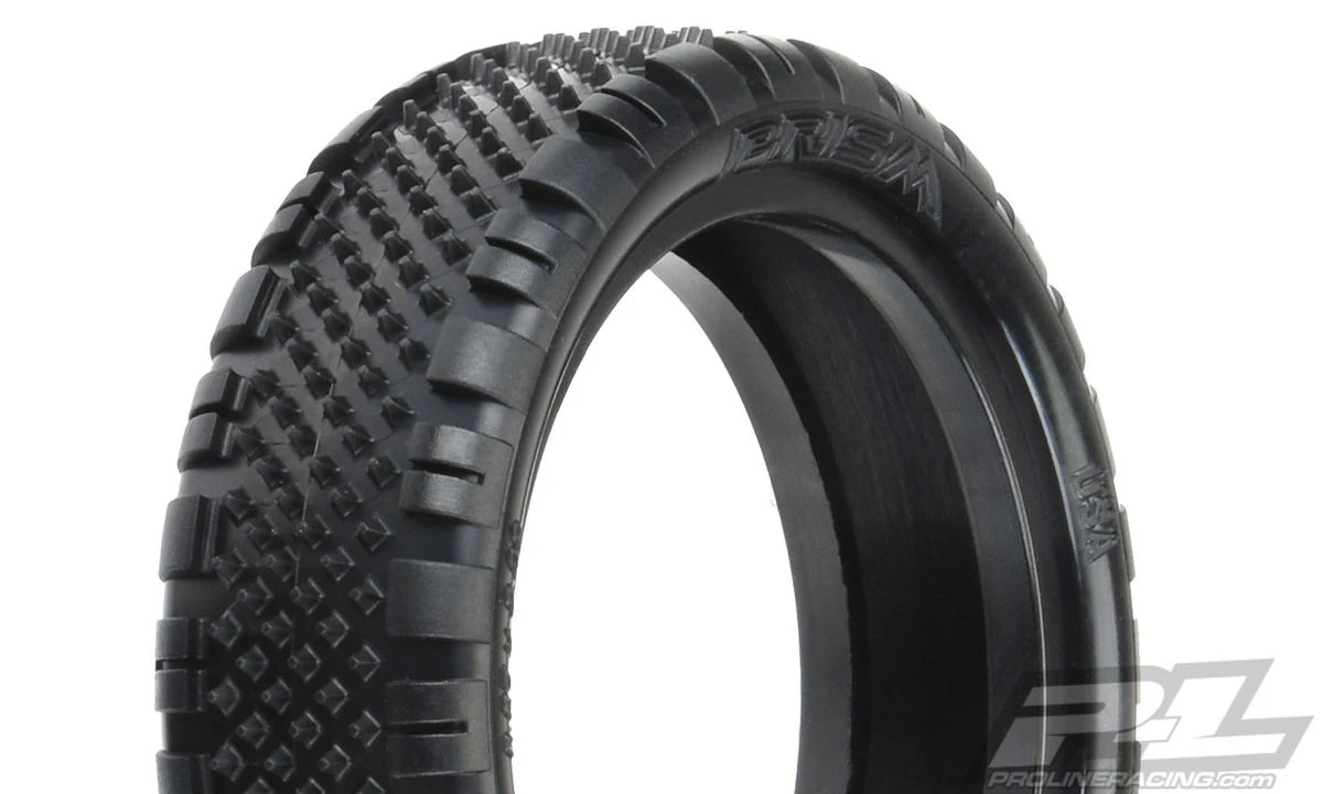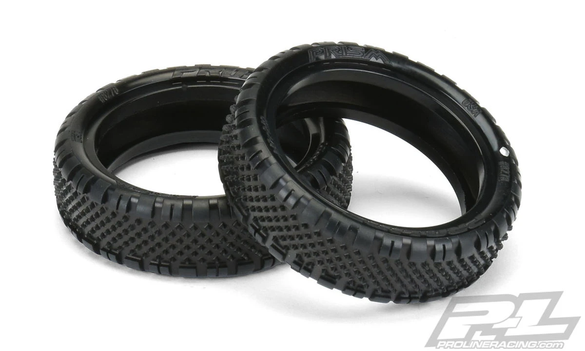 This is a pair of Prism 2wd Buggy Front Carpet Tires. Introducing the all-new Prism 2wd Front Carpet Buggy race tire! The Prism 2wd front features tons of Ultra-Sharp Prism shaped Pins in the middle of the tire combined with Wedge style pins on the outside for incredible steering on small and tight carpet tracks without the edgy feel of full pin tires.Â