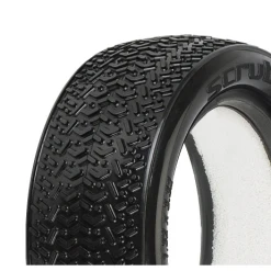 This is a pair of Scrubs 2.2″ 4WD Off-Road Buggy Front Tires. Stay in the groove with Pro-Line’s all new Scrubs 4WD front buggy tires. Designed specifically for wet/dry clay and hard packed tracks, the Pro-Line Scrubs front tire offers improved steering, handling and forward traction. The Scrubs tire features an angled bar design for tons of side bite, as well as a V-pin design which will make your buggy track straight as an arrow. When thinking about getting a new 4WD front buggy tire, think about Scrubbing past the competition. The same Scrubs 2WD technology that is currently dominating indoor/outdoor clay and hard pack tracks on the front of 2WD buggies can now be found on Pro-Line’s new Scrubs 4WD front!