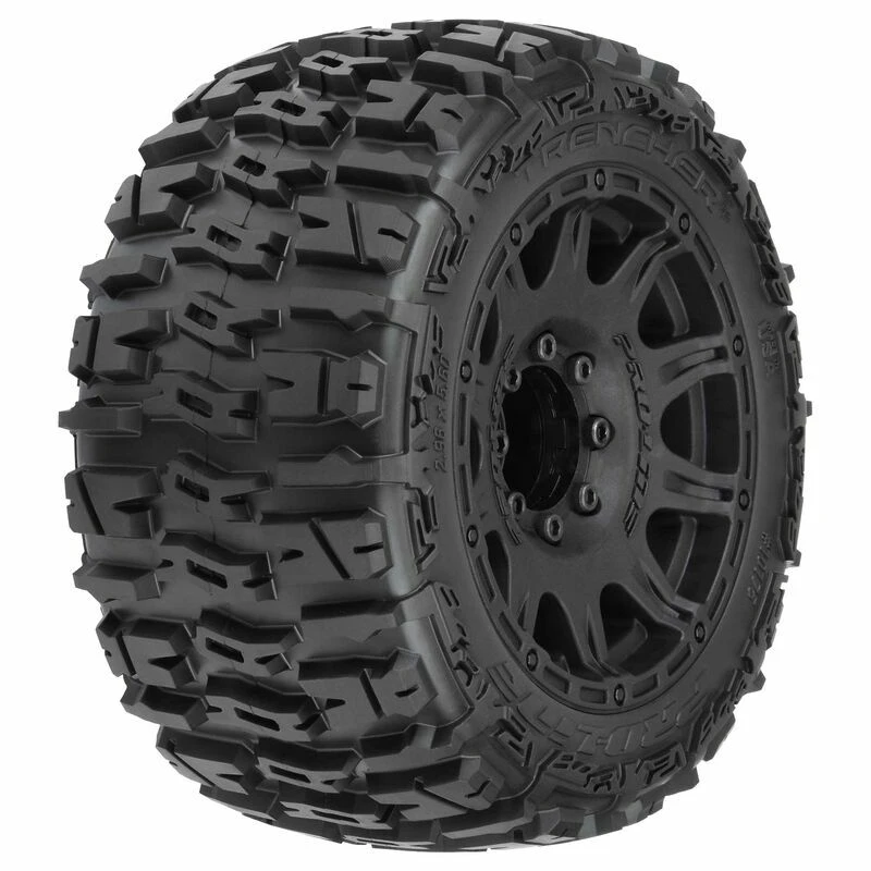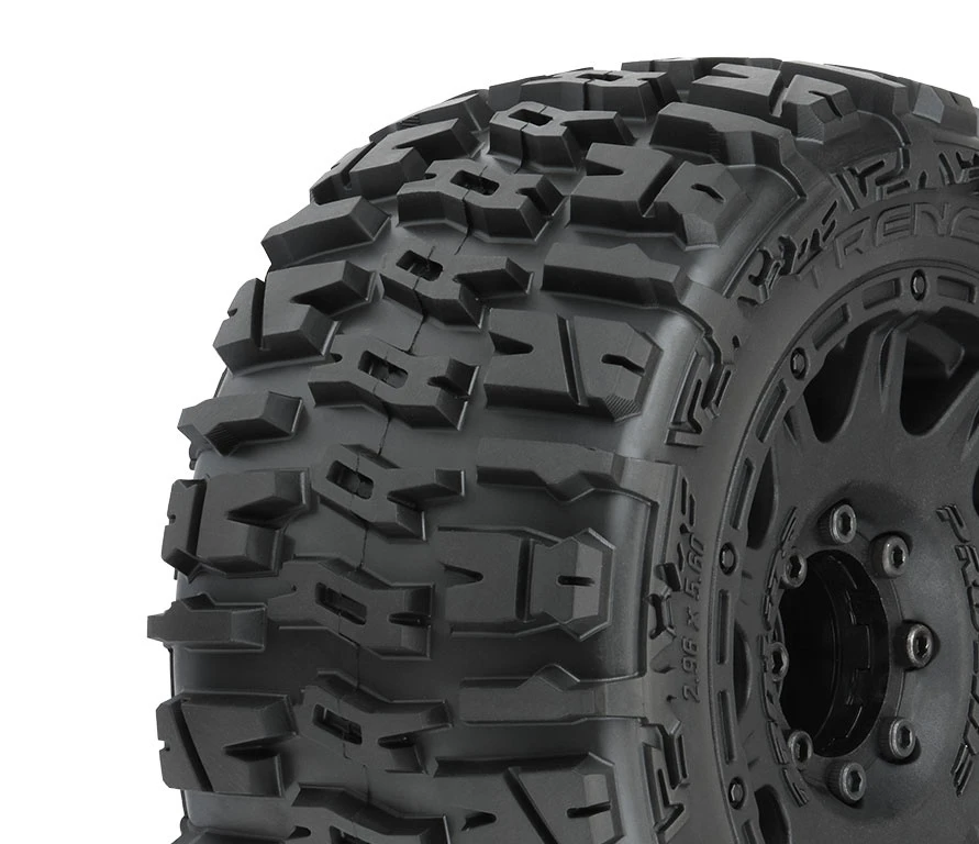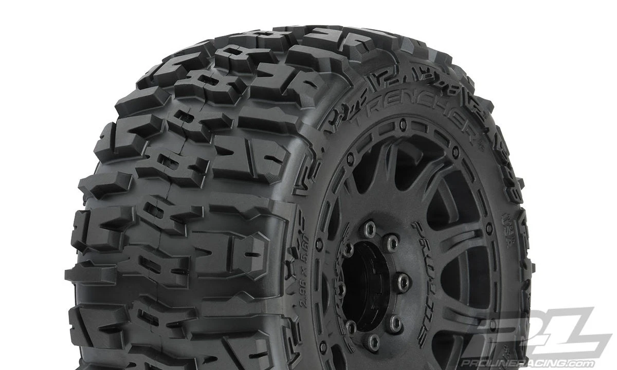 This is a pair of pre-mounted Trencher LP 3.8″ Monster Truck Tires.Pro-Line is stepping up the 3.8″ tire game for Traxxas® MAXX®fans with the all-new Trencher LP 3.8″ tires! The Trencher LP tires aredesigned to give your MT optimal traction on just about any surface andcome in at 2.96″ wide by 5.6″ tall making it perfect for your MAXX® orLow Profile 1:8 Monster Truck build. Super cool horizontal H shapedtreads give your MT ridiculous amounts of forward bite and with thesuper tall Trencher tread, you’ll find that durability and longevity youhave been searching for.