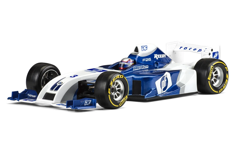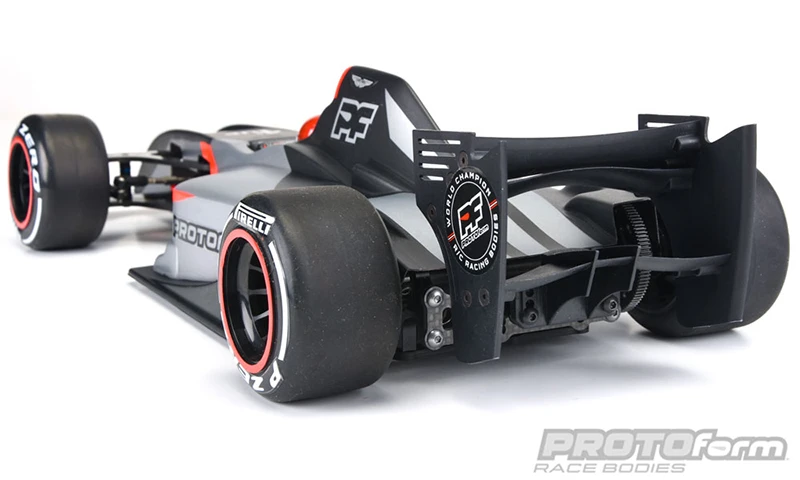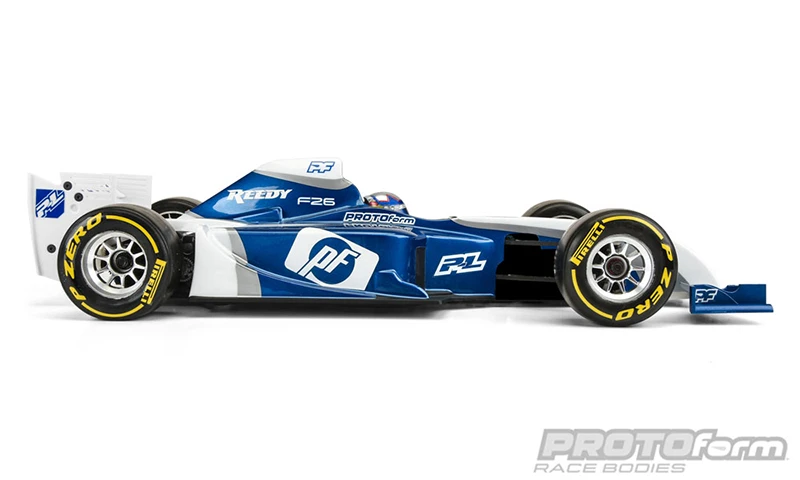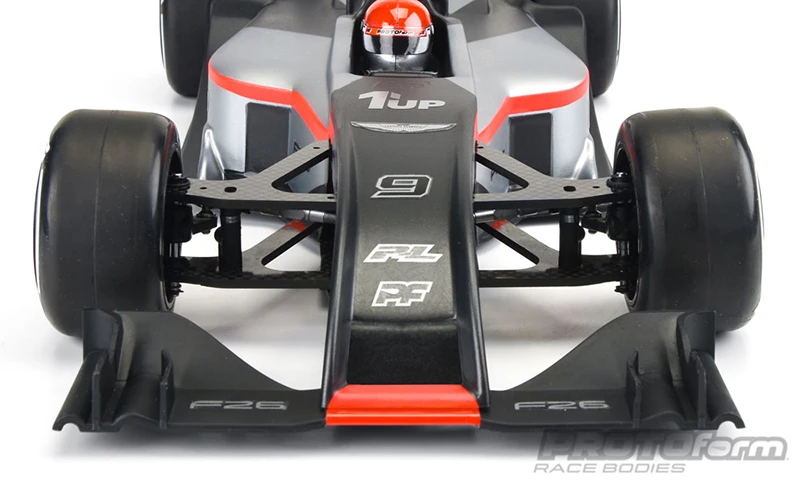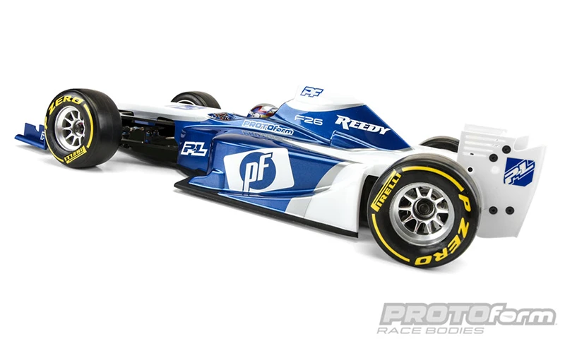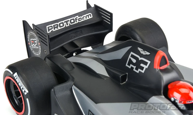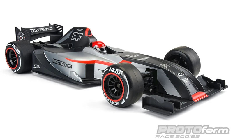 Protoform are excited to usher in a new line of race bodies for your 1:10 Formula 1 car, focusing on all-out performance, high downforce and easy fitment. Say hello to the F26. The all-new F26 takes inspiration from one of the most radical and progressive designs that full-scale open-wheel racing has ever seen. A wide, channeled nose provides more front-end grip, balanced by side winglets that plant the rear of your car. Towards the back of the body, a rear deck area featuring a spur gear cover directs airflow efficiently to the rear wing. The area surrounding the rear pod has ample clearance for batteries, side tubes and motor wires, making the F26 incredibly easy to mount. Included with this body is a lightweight nylon driver helmet for an added touch of scale realism. The decal sheet includes steering wheel and seatbelt graphics as well as helmet visors and PROTOform logos in a wide variety of colors. This body is pulled in our lightweight, high-quality polycarbonate with overspray film, and is proudly Made in the USA. Pro-Line Clear Body Features: