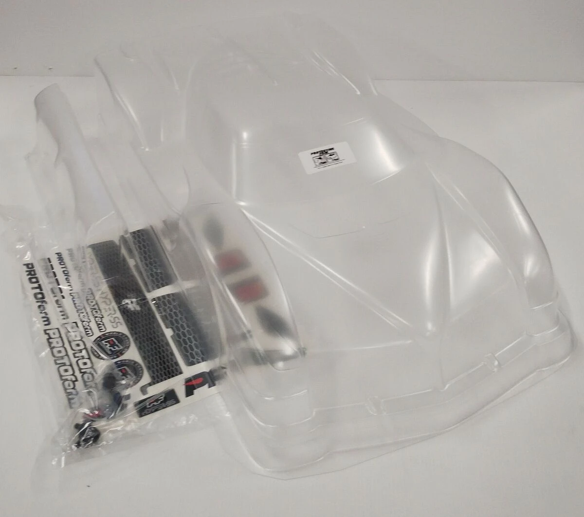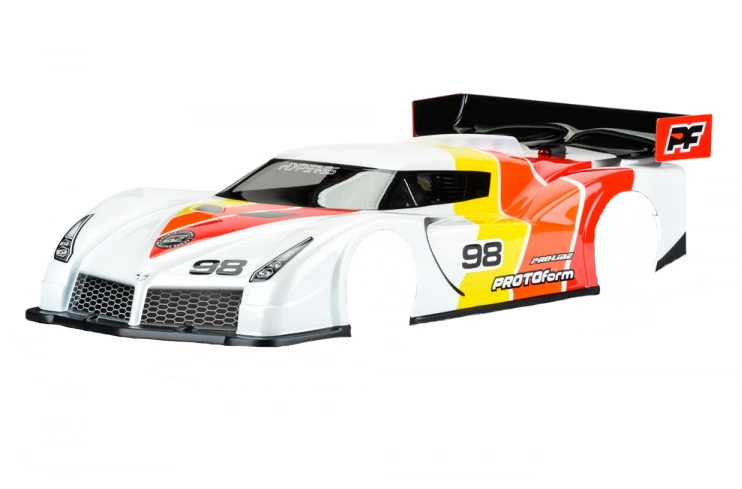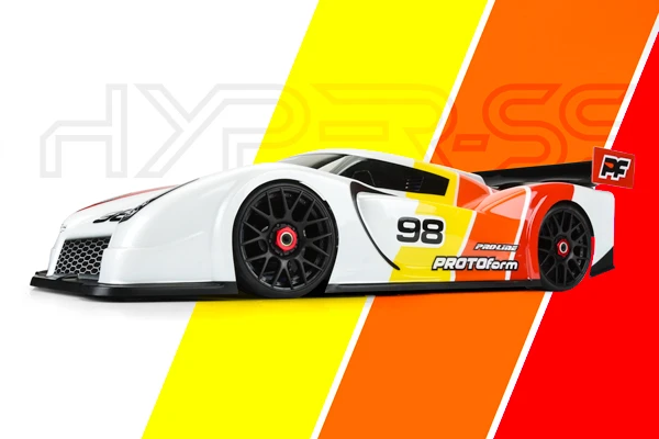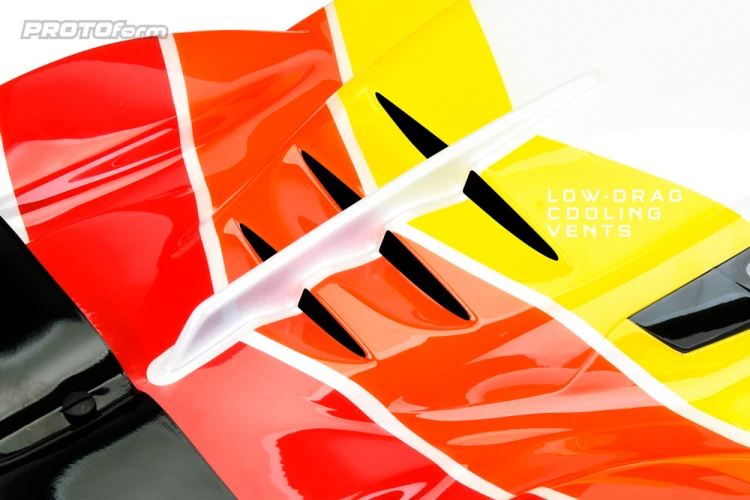 So we’re following suit here at PROTOform. The game-changing Hyper-SS race body brings 1/8th GT cars into the 21st Century in both style and performance. The radical, low-slung shape includes a unique rear-wing with molded-in Gurney flap. At the rear window area, low-drag louver vents can be trimmed out to allow for efficient engine cooling if required. The Hyper-SS meets all 1/8th GT Global Body Spec rules and is already approved for IFMAR competition at the upcoming World Championship