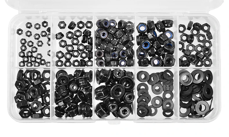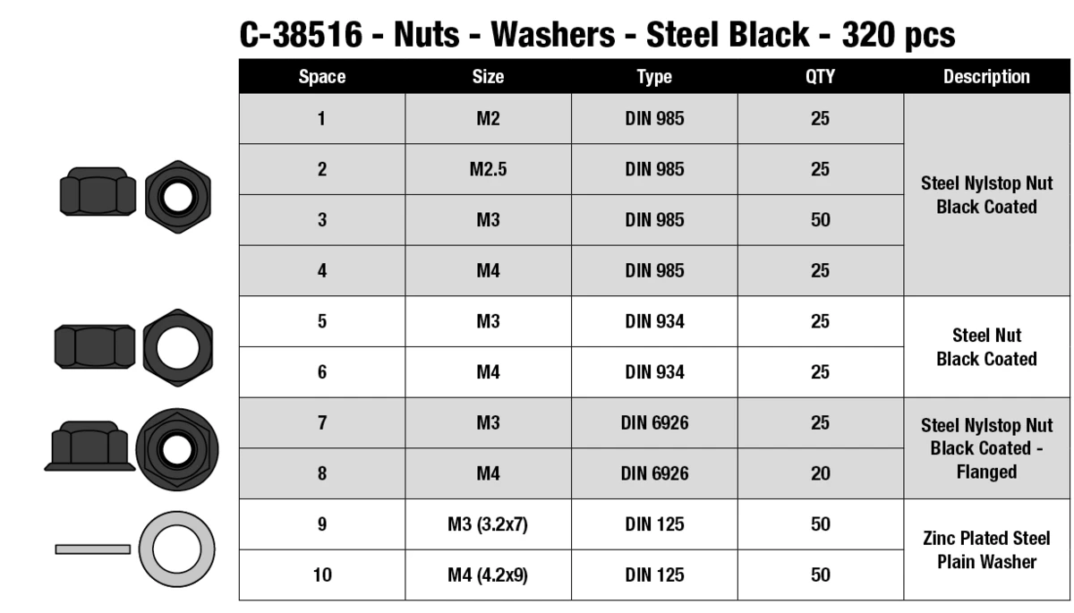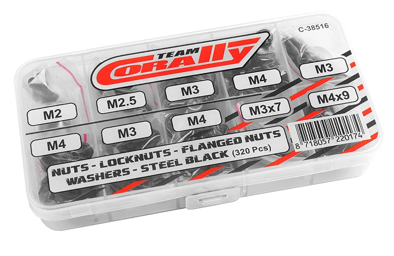 Team Corally – Nuts – Lock Nuts – Washers Set – M2 – M2.5 – M3 – M4 – Steel Black – 10 Sizes – 320 pcs