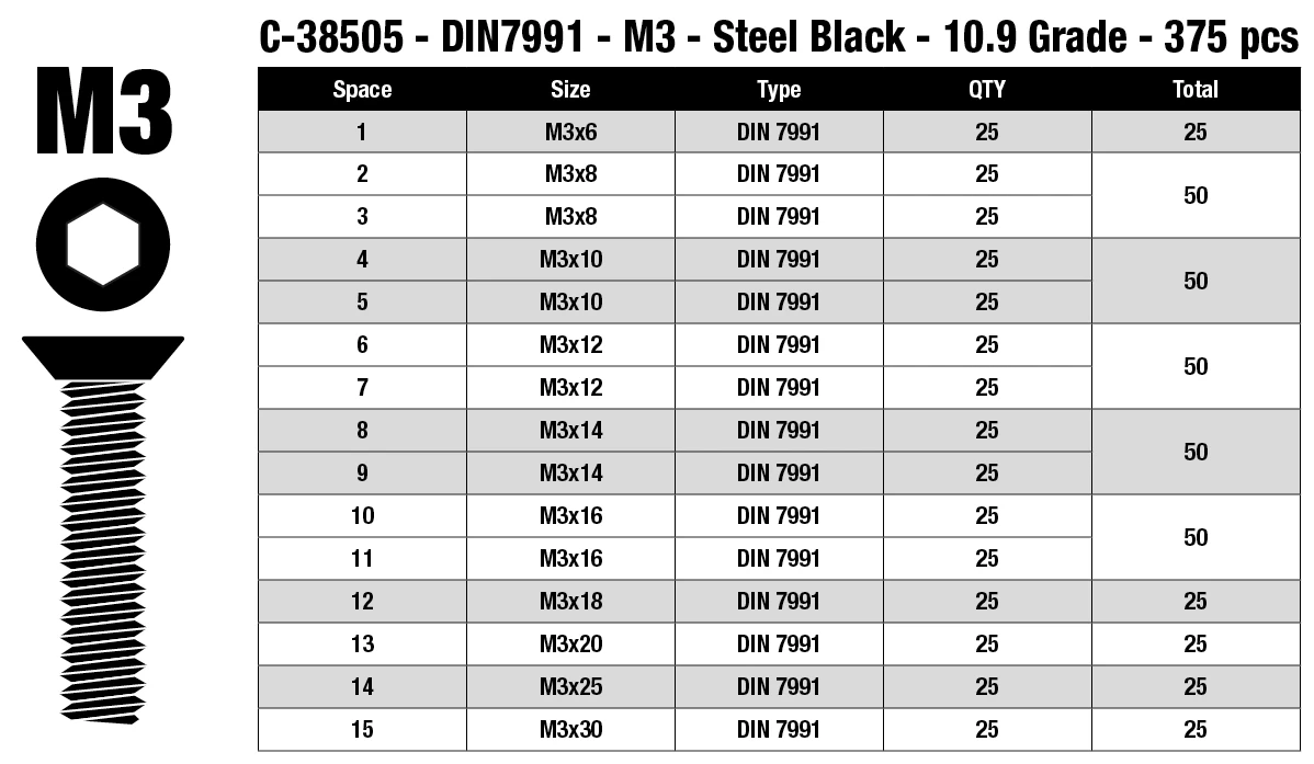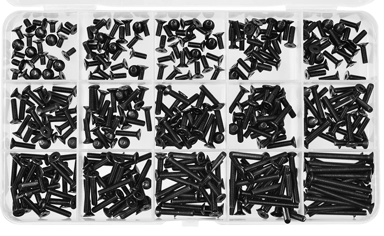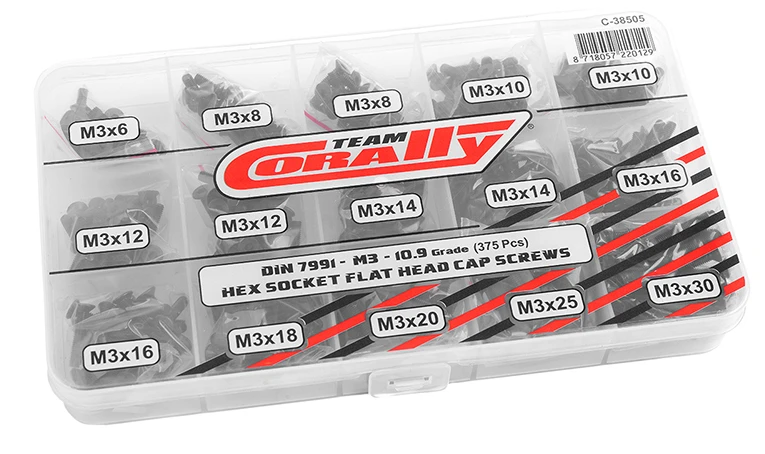 Team Corally – Screw Set M3 – Hex Flat Head – DIN 7991 – Steel Black – 10.9 Grade – 15 Sizes – 375 pc