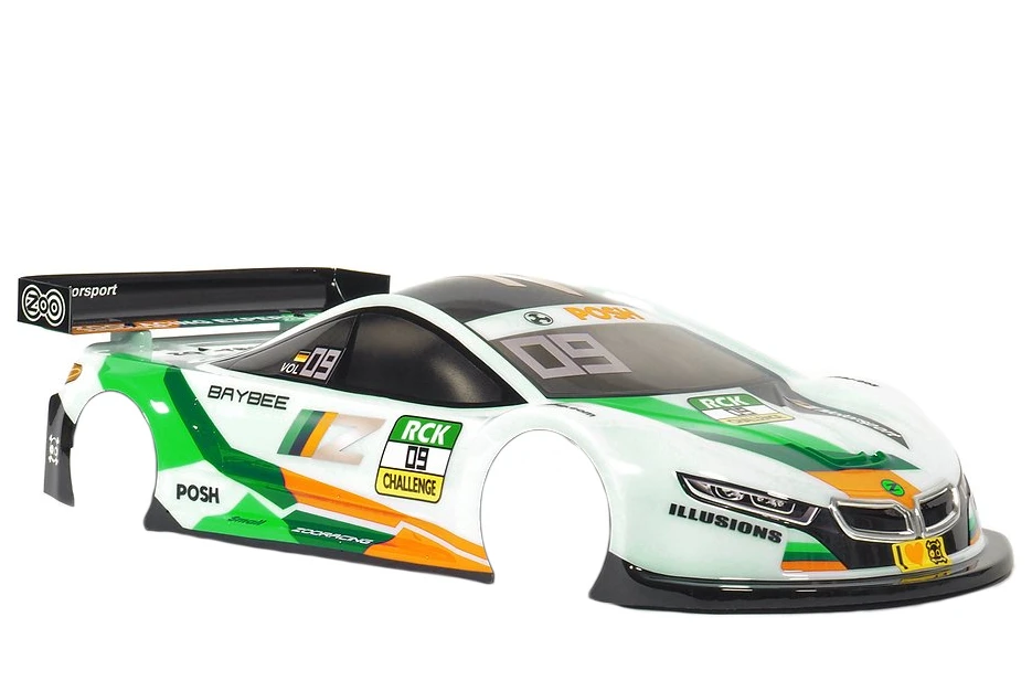 The BAYBEE body shell for 190mm touring cars is ZooRacing’s latest high performance touring car lid. It is basically an evolution of the ultra-popular DBX with a comparable roof line and design, however the slightly stretched roof reduces aerodynamic drag, resulting in higher corning speeds, something especially stock class racers will be looking for. New for the BAYBEE is also a longer and rounder front end shape for increased corner speeds under power, allowing for precise handling especially in larger corners while reducing tyre scrub at the same time which further helps to maintain high speeds and smooth cornering. All this comes without sacrificing low-speed steering with the BAYBEE offering razor-sharp steering response in technical parts of the track. Compared to the already low-profile appearance of the DBX, the BAYBEE features a once more lowered shoulder line, hood and trunk section allowing to substantially to mount the body lower on the chassis, resulting in a once more lowered overall centre of gravity.