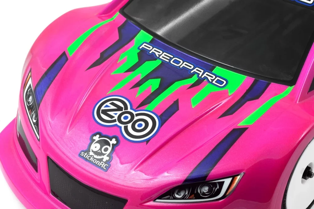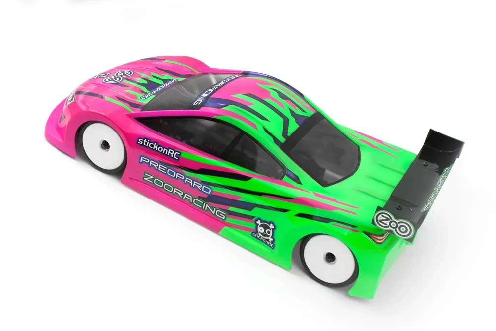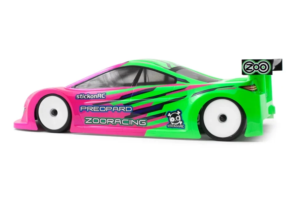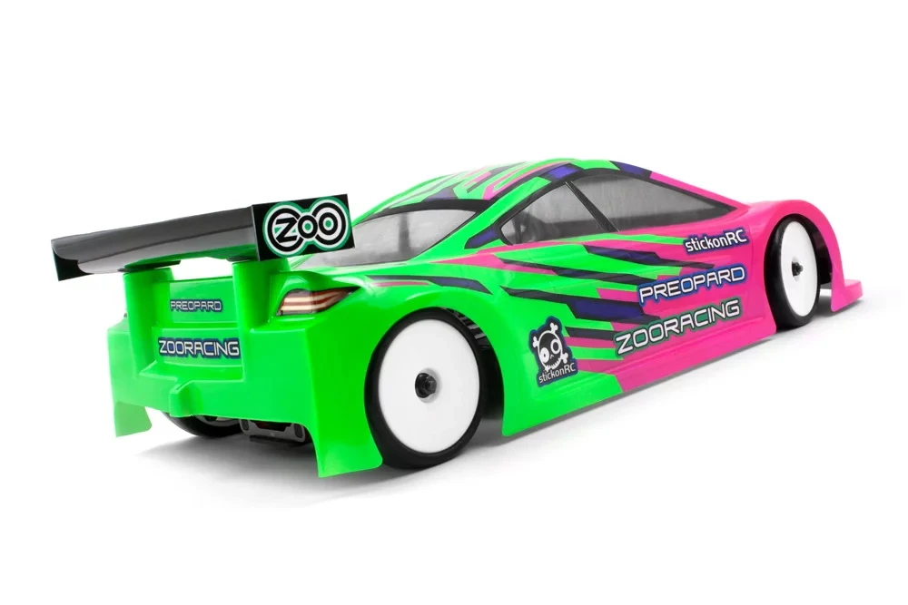 The Preopard body shell for 190mm touring cars is ZooRacing’s second touring car body shell following the ZooZilla body. Developed to produce high overall downforce with a focus on increased overall steering while maintaining exceptional rear end stability the specialised body is the ideal choice for tight and twitchy low to medium traction carpet and outdoor tracks. The shell features several aero features such as a recessed roof section that channels the airflow towards the rear wing for great rear end stability at both low and high speeds while the forward placed cabin and the specially shaped front end produce more steering compared to the ZooZilla as well as greater rotation in corners for greater corner speeds and a more nimble handling.